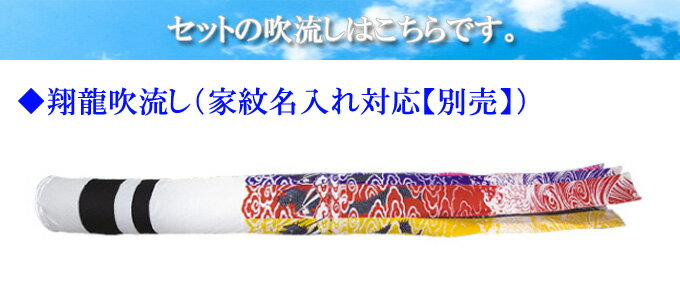 商品説明 セット内容 ・翔龍吹流し吹き流し ・鯉3匹 ・矢車セット スカイリー ・取付金具 A型 ・ロープ付ポールセット 20号(2.3m) 材 質 ナイロン生地 家紋入 ■翔龍吹き流し 家紋・名入可 ※下記バナーリンク先よりお選びください 送 料 -**-送料無料-**- ただし、北海道、沖縄、離島は別途料金がかかります。