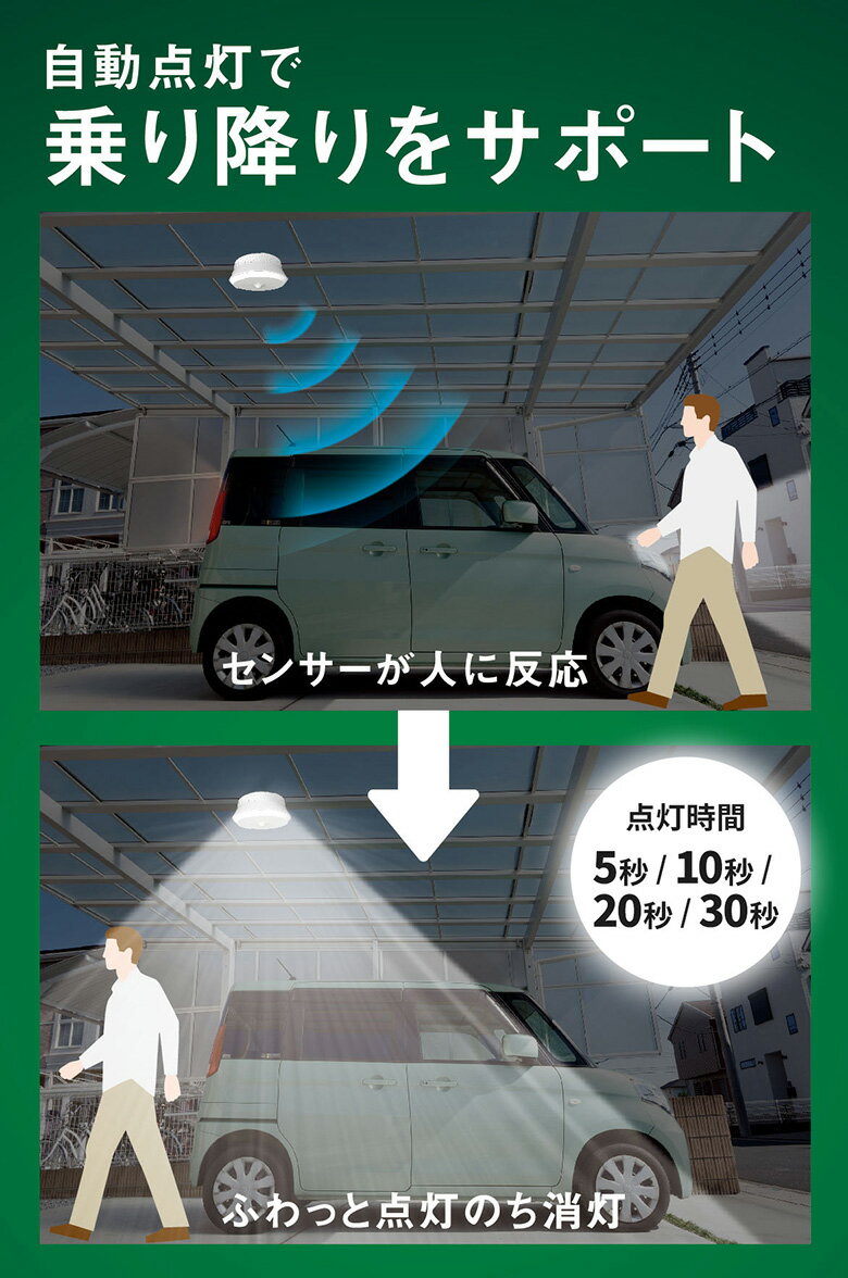 【センサー】 探知方式…焦電型赤外線センサー 探知範囲…360° 最遠 半径4m(取り付け高さ4m) 【点灯時間設定】5秒/10秒/20秒/30秒/投光器 【点灯切替機能】 昼夜…周囲が明るくても暗くても点灯 夕夜…周囲が薄暗くても暗くても点灯 夜…周囲が暗い時のみ点灯 真っ暗…周囲が真っ暗な時のみ点灯 【設置場所】奥内・屋外用(防雨タイプ IP44) ※1 LED球は交換できません。